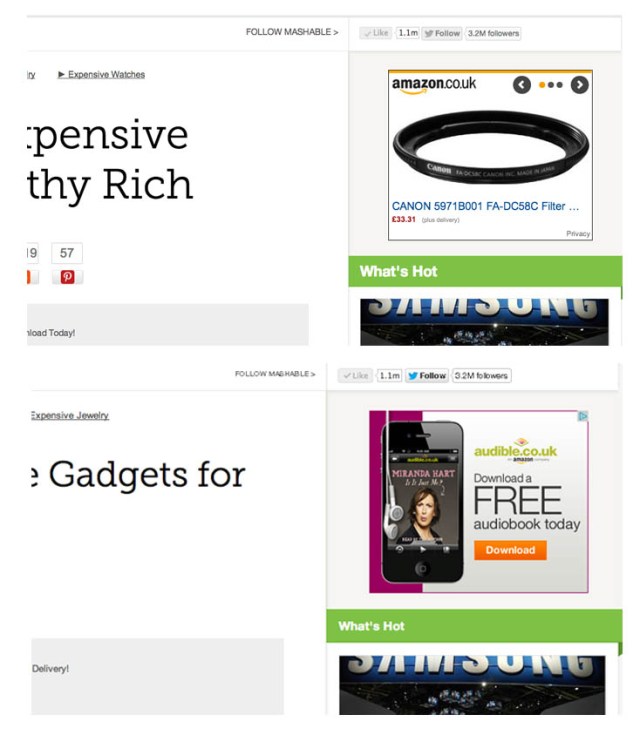 I’ve been researching the Canon G1x over the past few days and searching for products relating to that. Google now configures the adverts that appear along side the blog pages I read accordingly. The two screen captures are of the same tech blog – Mashable (http://mashable.com/2012/08/28/most-expensive-gadgets/) – the same page viewed in Chrome, with an advert tailored to my recent search history, and viewed in Safari where the adverts are much more general. I would guess that Google is paid more for adverts aimed at the user than not.
