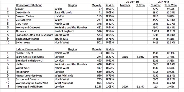 At the start of the election I mentioned a number of things to look out for and the first two were: The size of the UKIP collapse and the size of the Liberal Democrat revival. With this morning’s headline in mind I think it might just be worth while looking at the top ten marginals for Labour and Conservative: