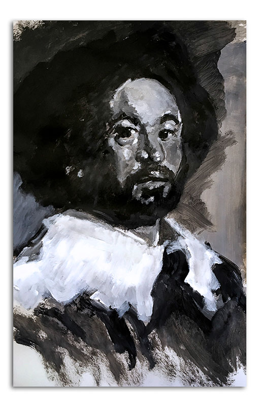 If it’s Monday then it is time for my painting class. This was my version of Portrait of Juan from Pareja by Diego Velázquez. As a painting exercise I’m quite pleased with the result but as a copy of the original? I’m really not at all sure whether there is much validity in that question as this was an exercise exploring a limited tonal range – in this case between black and white rather than making an absolute copy – for one thing this sketch was made in just under two and half hours using acrylic paints – neither restrictions I am sure were placed on Velázquez! Equally the large photocopy I was using was deliberately degraded to make the exploration of the tonal range easier. And of course there is the simple fact that Velázquez was a genius painter and I’m not. Given all these caveats I’m pleased with what I produced.