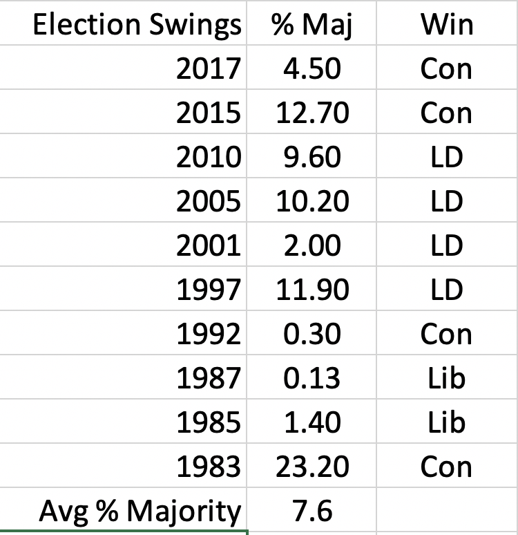 A win is a win but it is worth mentioning that is was really quite a close. This seat is usually a battle between the Conservatives and the Liberal Democrats and since 1983 the average swing from one to another has been 7.6%. This one was only 4.5% so it was a lot tighter than the victorious Liberal Democrats would let you believe.
