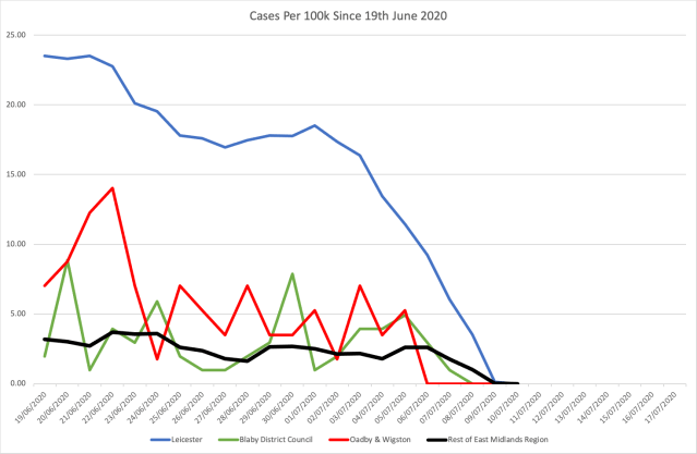 At the height of the problem in Leicester, a city of around 350 thousand the infection rate was 10 times higher than the rest of the East Midlands region which has a population of around 4 million – you can see that Oadby/Wigston & Blaby were really bad as well. Now we can argue about where the boundary line was drawn but clearly something had to be done. Fortunately, it would seem that the semi lockdown is working and we can only hope that the current position of zero infections continues.