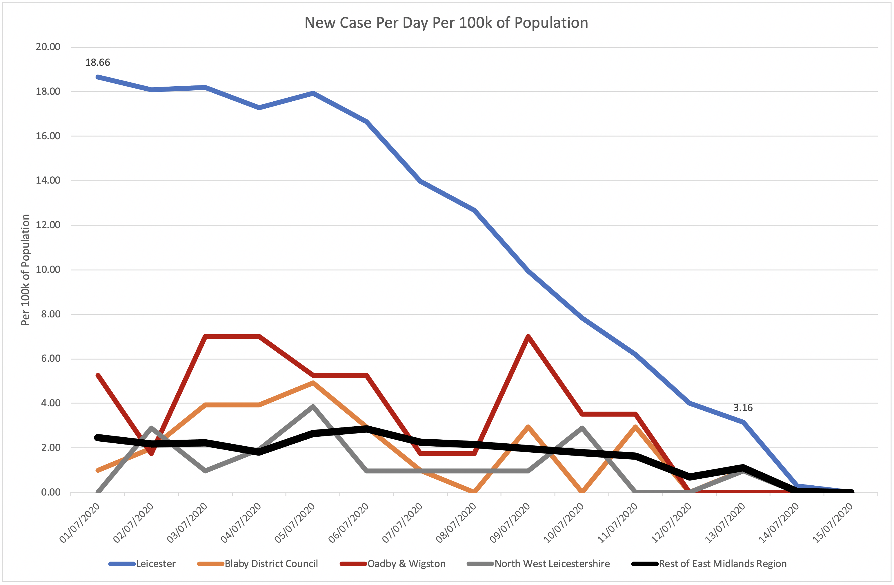 It is clear that the number of new cases recorded in the City of Leicester has significantly reduced from 18.66/100k on the 1st July 2020 to 3.16 on the 13th July 2020 (It takes a couple of days for the numbers to settled down hence I have chosen the 13th). However, when this is compared to the Rest of the East Midland line it is clear that this is still much higher than the rest of the East Midland number. Nonetheless it does represent a four fold reduction in new case in less than 14 days which it has to be said is impressive.