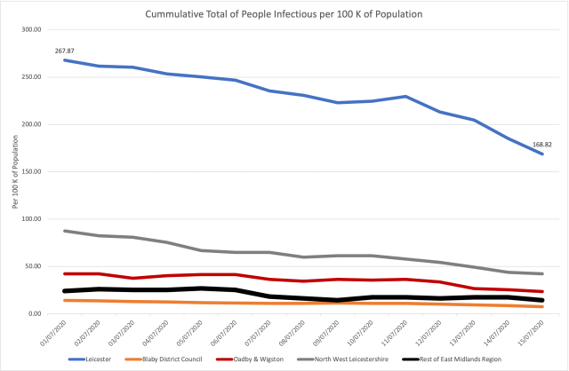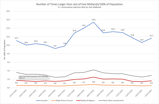 Individual new case per day is an important indicator. However, those people stay infectious for a number of days. It is far from clear as to how long this might be or how long the individual might have been infected before being tested. What is clear is that there is a cohort of people at any day who we know are infectious and so I have decided to use the quarantine guidance i.e you must isolate for 14 days to give an idea as to the size of the cohort of infectious people. To do this the previous 13 days number of recorded infected people have been added to current day’s infected to provide a number. This is somewhat crude but without any greater understanding of how the infectious spreads it is the best I can do. So the first graph shows that the City of Leicester has reduced the size of the cohort from 267.87/100k population to 168.82 – a reduction of just over one third. However, when compared to the rest of the East Midlands performance over the same time it can be seen that there is a significant way to go. The graph below illustrates this very well: Whereas Blaby District Council is for all intents and purpose the same as the Rest of the East Midlands Leicester is still 11.7 times larger.