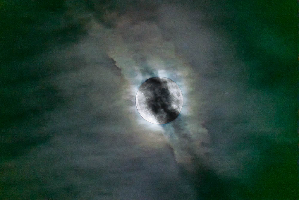 The only time I was able to capture a ‘blue’ moon was when clouds and contrails drifted across the sky and the light reflect from the moon was refracted through them.