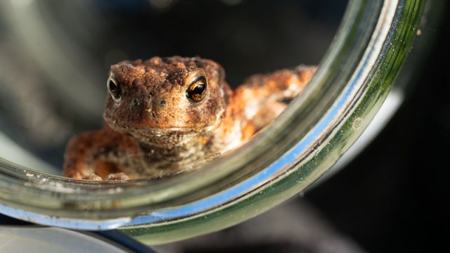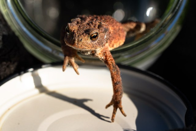 One never knows just what little creature will turn up when clearing out years of rubbish from the garage. Today it was a young Common Toad. We moved it in a glass jar to a part of the garden that we hoped would be suitable for its toad needs.