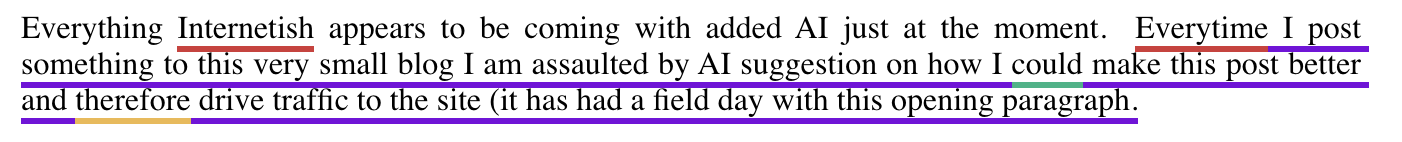 Everything Internetish appears to be coming with added AI just at the moment. Everytime I post something to this very small blog I am assaulted by AI suggestion on how I could make this post better and therefore drive traffic to the site (it has had a field day with this opening paragraph. )